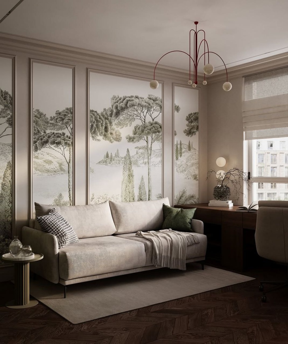 Спокойный, но акцентный кабинет от @sloyarch студии интерьерного дизайна Кабинет оформлен в изысканном и спокойном стиле, сочетающем элементы классики и современности. Центральное место в интерьере занимают обои из коллекции #Wallpaperpart3@affrescoru (арт.AF2320-COL4), которые сразу привлекают внимание. Рисунок выполнен в монохромной гамме с преобладанием серых и зелёных оттенков, что создаёт ощущение умиротворённости и гармонии. Такой дизайн напоминает классические восточные или европейские гравюры, но адаптирован для современного интерьера. Особенности обоев: ▪️Вертикальное деление на панели — рисунок разбит на несколько частей, каждая из которых обрамлена тонкими декоративными молдингами. Это визуально «поднимает» потолок и добавляет структуру стене. ▪️Нейтральная цветовая палитра — не перегружает пространство, а наоборот, делает его более светлым и просторным. ▪️Пейзаж с природными мотивами — создаёт расслабляющую атмосферу, идеально подходящую для кабинета, где важна концентра