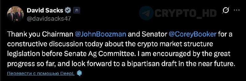 🇺🇸 Криптоцарь Белого дома Дэвид Сакс заявил, что в регулировании крипторынка в США есть серьезный прогресс. Мы провели конструктивное обсуждение законопроекта о рыночной структуре криптоиндустрии (CLARITY) . Я воодушевлен большим прогрессом и жду появления двухпартийного проекта в ближайшее время. Сryptо Headlines