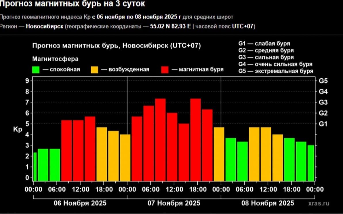 По данным российских астрофизиков из Лаборатории солнечной астрономии ИКИ РАН, в пятницу, на некогда праздничное 7 ноября, геомагнитные возмущения на Солнце достигнут значений G3 и G4, или от «сильных» до «очень сильных». Но скорее будет так, говорят ученые: