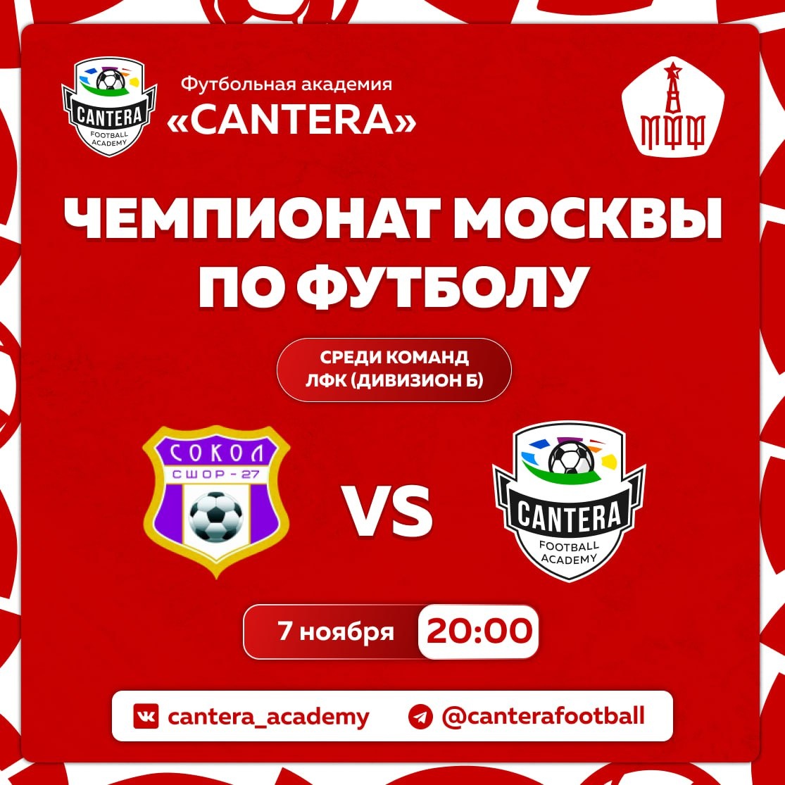 Финальный матч сезона в ЛФК ✨ Нашим ребятам предстоит сыграть за 5 место против «Сокола». Игра пройдет 7 ноября в 20:00 на стадионе «Арена-Сокол» 🏟 Вместе смотрим трансляцию матча и болеем за «кантеровцев» 💪 VAMOS CANTERA!❤️💛
