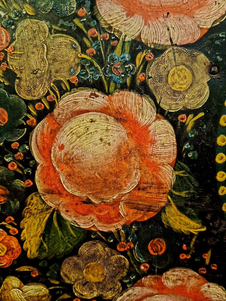 Розаны в стиле ярославской кистевой росписи украшают свадебный сундук с приданым невесты. «Розан, мой розан, да виноград зеленый» - повторяется в припеве величальной песни свадебного обряда. Розан (роза) - олицетворение цветущей красоты и молодости жениха и невесты. На сундуке два цветущих сада, два лебедя. Пара лебедей в свадебной символике – это не только вечная любовь и верность молодожёнов, но и оберег от завистливых глаз на долгую и счастливую семейную жизнь. Бутоны розанов объемные, словно «светятся» изнутри, что достигается особенностями техники. Каждый элемент выполняется одним мазком, без «подмалевок». Художник без прорисовки кистью одновременно наносил две-три контрастные краски, оттеняя детали рисунка. Темный фон усиливает звучание цвета. В музей сундук поступил из Угличского молитвенного дома Выжиловых. 1837 год - вероятно - дата изготовления или свадьбы. Кому принадлежат инициалы «Ф.н» и «З» пока - загадка #экспозицияЗаБЫТоеИскусствоВещьиШедевр