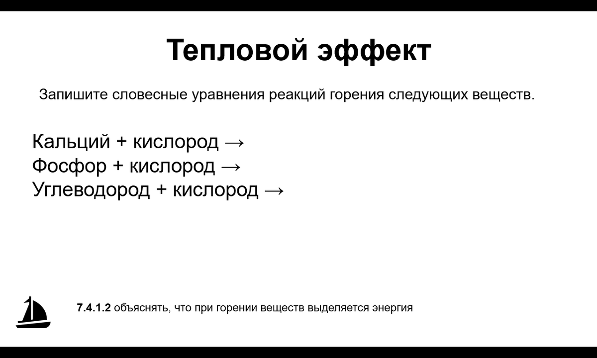 При горении веществ выделяется энергия, главным образом в виде тепла и света. Это объясняется тем, что горение является экзотермическим процессом, то есть реакцией, при которой энергия выделяется в окружающую среду. Вы помните эксперимент со свечой? Тот самый, где я увидела свечение пламени и обожглась. Это и есть главные признаки реакций горения. Когда вещество вступает в реакцию с кислородом из воздуха, образуются новые химические связи. Избыток энергии выделяется наружу, повышая температуру окружающей среды и испуская свет. Это можно наблюдать на примере горения угля, дров или свечи: тепло, которое мы ощущаем, и свет, который мы видим, — это энергия, высвободившаяся в результате реакции с кислородом. Обычно в уравнениях реакций принято записывать формулы веществ: реагентов и продуктов. Однако сегодня, при изучении реакции горения, важно подчеркнуть выделение энергии в реакциях горения. Поэтому при записи уравнений реакций горения к продуктам горения будем приписывать + энергия. Свер