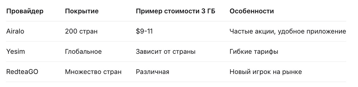 - Длительное пребывание в одной стране → местная SIM-карта + запасная eSIM
