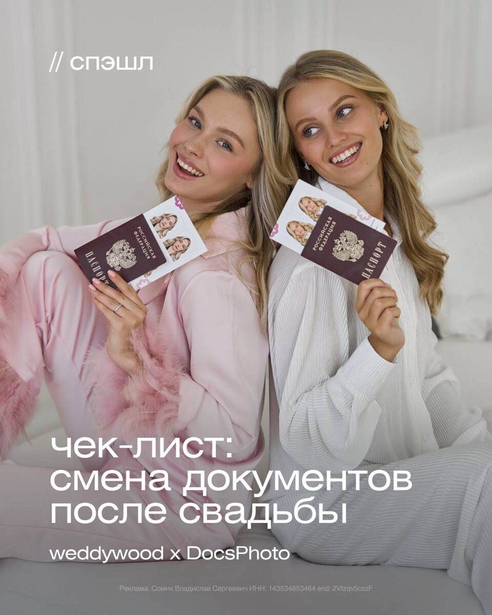 ❤️ Невесты, этот пост must read! Совместно с сервисом DocsPhoto подготовили чек-лист по смене документов после свадьбы: ▶️ Какие документы нужно менять? ▶️ В какие сроки это необходимо сделать? ▶️ В какие документы достаточно внести изменения? А приятная смена документов начинается с фото, которое нравится, поэтому у DocsPhoto есть маст-услуга для невест – «фото на 2 и более документа». Из одного селфи ребята подготовят фото на разные типы документов 🔥 Кстати, фото вы можете сделать через селфи и указать свои пожелания по обработке ⭐️ Смотрите чек-лист на сайте Weddywood! ~ сайт DocsPhoto ~ телеграм ~ вконтакте ~ соцсеть