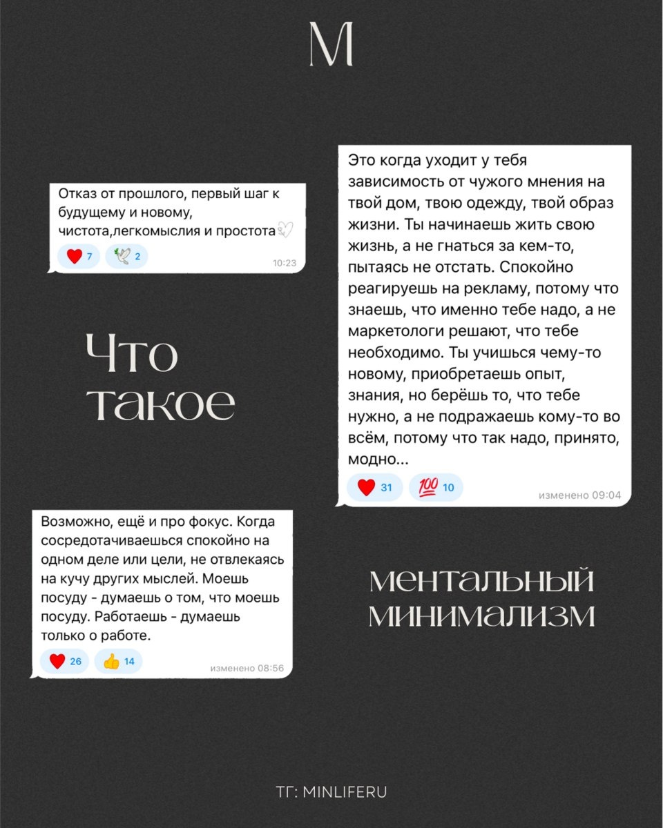 Ментальный минимализм у каждого свой Для кого-то это отказ от прошлого, Для кого-то — от чужого мнения, Для кого-то — от ненужных людей рядом, А для кого-то — возможность сфокусироваться на приоритетных вещах и отпустить внутренний шум. Сколько людей, столько и смыслов. Мы рады, что вы поделились своими смыслами в одном из предыдущих постов. И несмотря на то, что все ваши ответы звучали по-разному, в них есть кое-что общее. Ментальный минимализм, как и любой другой вид минимализма, — это отказ от лишнего. От всего, что мешает двигаться вперёд. И выбор в пользу главного и по-настоящему важного. Как бы ни звучало это определение, одно остаётся неизменным: ментальный минимализм делает жизнь спокойнее, ярче и качественнее. В следующих постах мы расскажем, что он значит для нашего проекта и как вы можете привнести ментальный минимализм в свою жизнь.