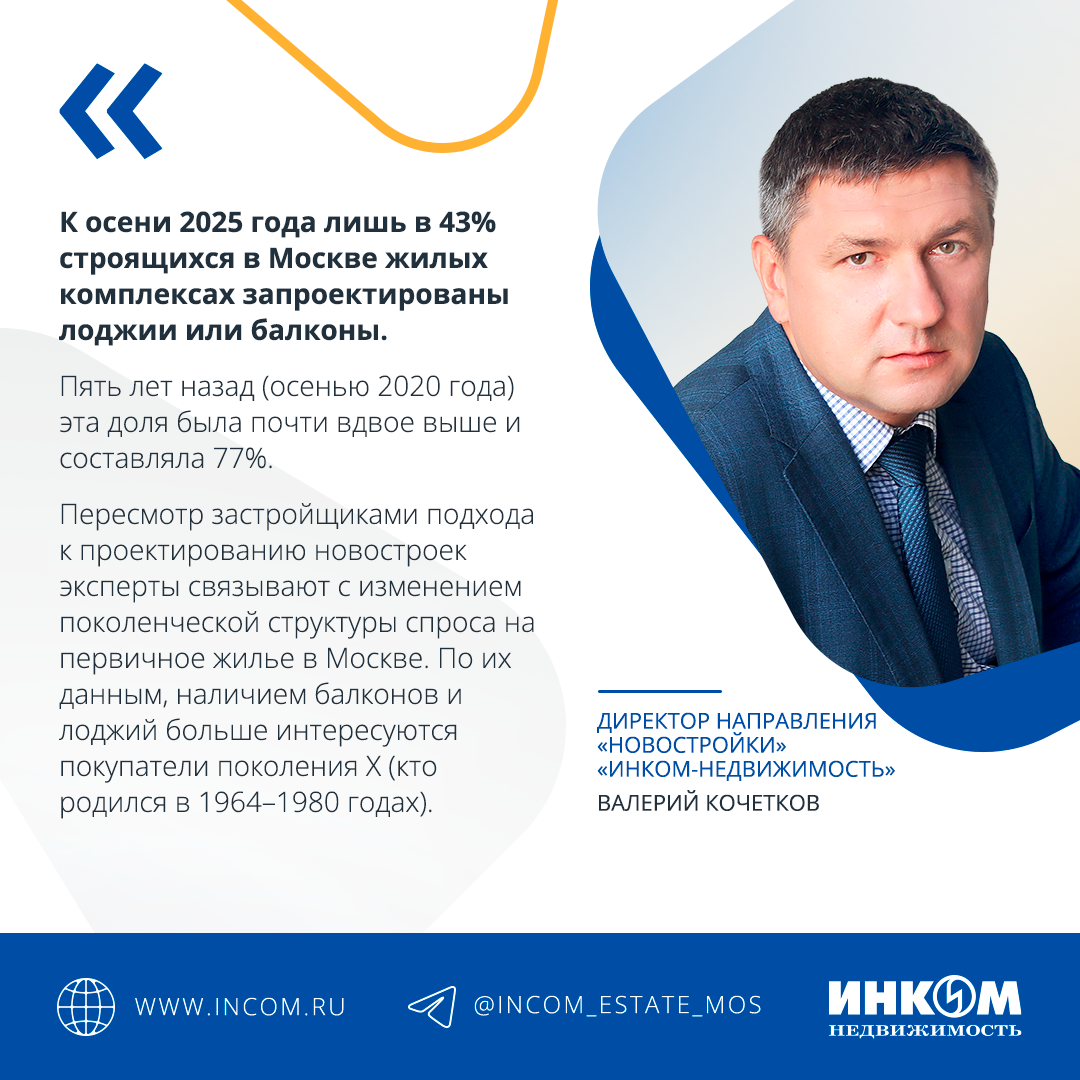 К осени 2025 года лишь в 43% строящихся в Москве жилых комплексах запроектированы лоджии или балконы. Пять лет назад (осенью 2020 года) эта доля была почти вдвое выше и составляла 77%, подсчитали аналитики агентства «Инком-Недвижимость».