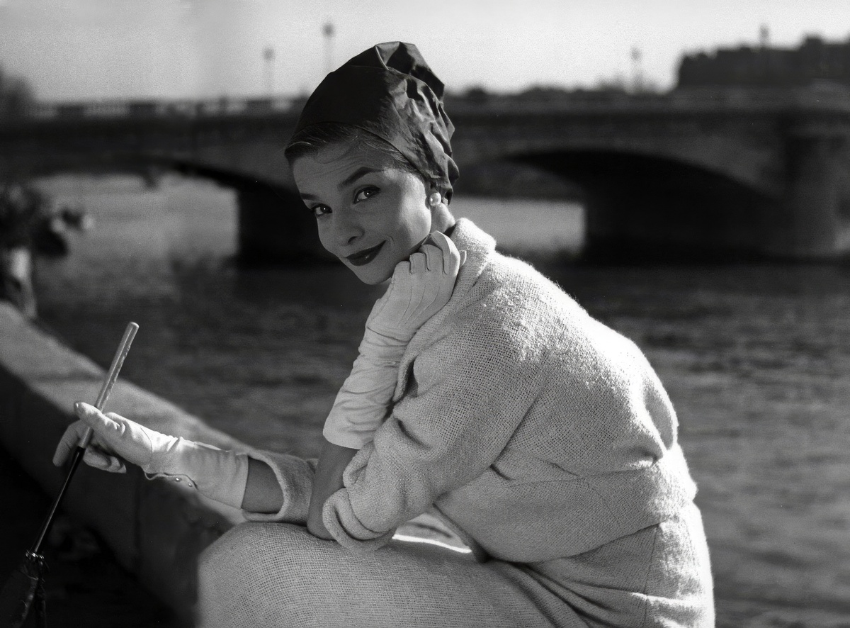 Вот пример. Модель сидит на парапете, рядом рыбаки тянут свои снасти из Сены, на заднем плане - мост и невозмутимый Париж. Юбка аккуратно разложена, шляпка, жемчужное ожерелье, но в позе читается чистое любопытство: что там поймали, не зацепился ли кто за подол моды удочкой. Кадр работает как маленький фильм, где героиня на минуту отвлеклась от фотосессии и полностью забыла про рекламную задачу.