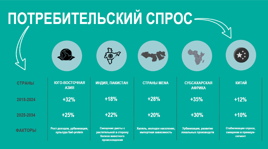 В мировой структуре спроса на мясо за последние десять лет наблюдается устойчивое смещение в сторону развивающихся регионов. Именно Азия, Африка и Ближний Восток станут основными точками роста потребления в ближайшие десять лет. Рост доходов, урбанизация, изменение образа жизни и демографический взрыв превращают эти регионы в ядро «белкового будущего», тогда как развитые рынки выходят на плато.