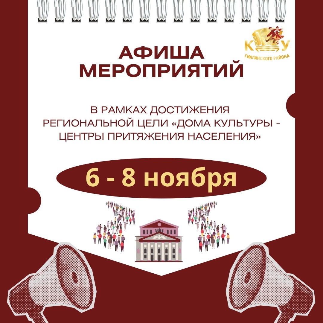 Подборка мероприятий в рамках достижения региональной цели «Дома культуры - центры притяжения населения» этой недели. 6 ноября 🕙11:00 Дондуковский СДК Экологическая викторина для детей «Земля – наш дом!» 🕓16:00 СК х.Садовый Творческая встреча танцевального коллектива «Метелица» Келермесского СДК с хореографическим коллективом «Феникс» СК х.Садовый «Звезд земных танцевальная россыпь» 8 ноября 🕚11:00 Сергиевский СДК Развлекательная программа для детей «Приготовься к приключению удивительных эмоций» #Гиагинскийрайон #культурарайона