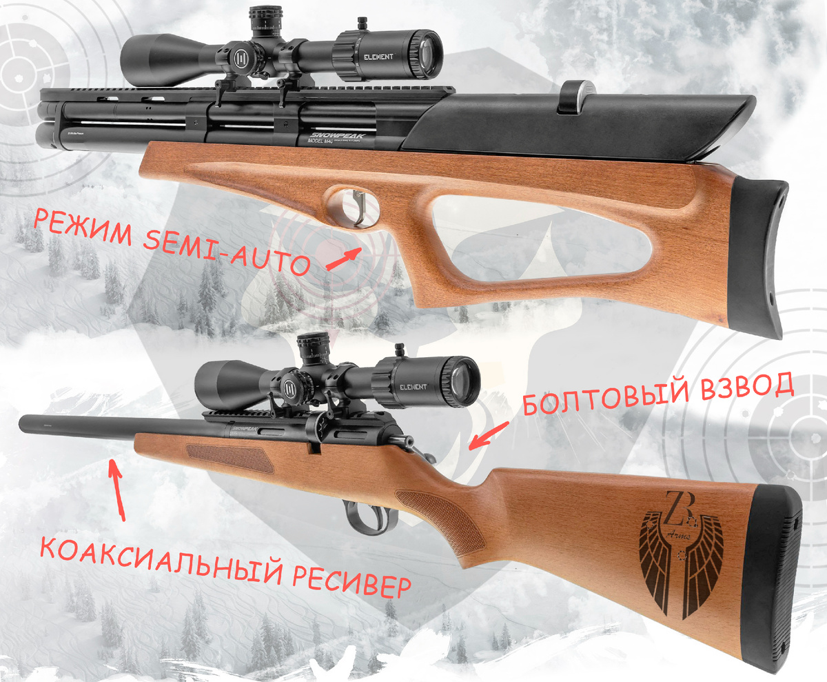 Внутреннее устройство ZR Arms PCP, кроме прочего, предполагает гибкую настройку благодаря наличию редуктора. Экземпляры выпускаются во всех ходовых калибрах и компоновках с деревянной и полимерной ложей, а режим стрельбы не ограничивается одиночным. Так линейка пневматики также включает полуавтоматы - к примеру, в M40 понадобится только первый раз взвести затвор, после чего можно непрерывно нажимать на спуск до полного опустошения барабанного магазина.