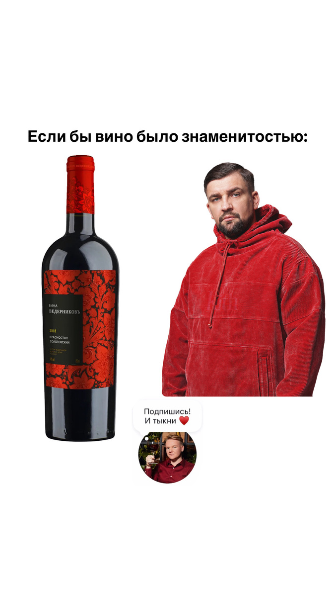 1. Баста и Красностоп Золотовский от винодельни Ведерников. Идеальное сравнение, так они оба ростовские автохтоны (местные типа), оба мощные, напористые и оба могут стоить космических денег. ⠀ 2. Филипп Киркоров и игристое Мысхако. Это просто народные любимцы. Их уважают и почитают. Они максимально понятные и их знают все — от зумеров до бабушек. А еще они оба создают праздничное настроение. ⠀ 3. Витя АК и Зинфандель из США. Честно скажу, что я искал этот американский Зинфандель в объеме 0.187, но не нашел… Но всё остальное подошло идеально! Добавить нечего. Витя кумир моего детства, а Зинфандель плотное и джемовое вино про которое так и хочется сказать «У щет, мэн, гад дэмн, как же вкусно!». ⠀ 4. ANNA ASTI и (неожиданно) MARTINI ASTI. Попсятина попсятиной, короче. Ничего интересного для прошаренного зрителя. Слишком приторно. ⠀ 5. ICEGERGERT и MATSU EL PICARO. Два дерзких засранца за исполнения которых, старшим бывает стыдно… Но всё-таки есть в них что-то завораживающее и гангстерск