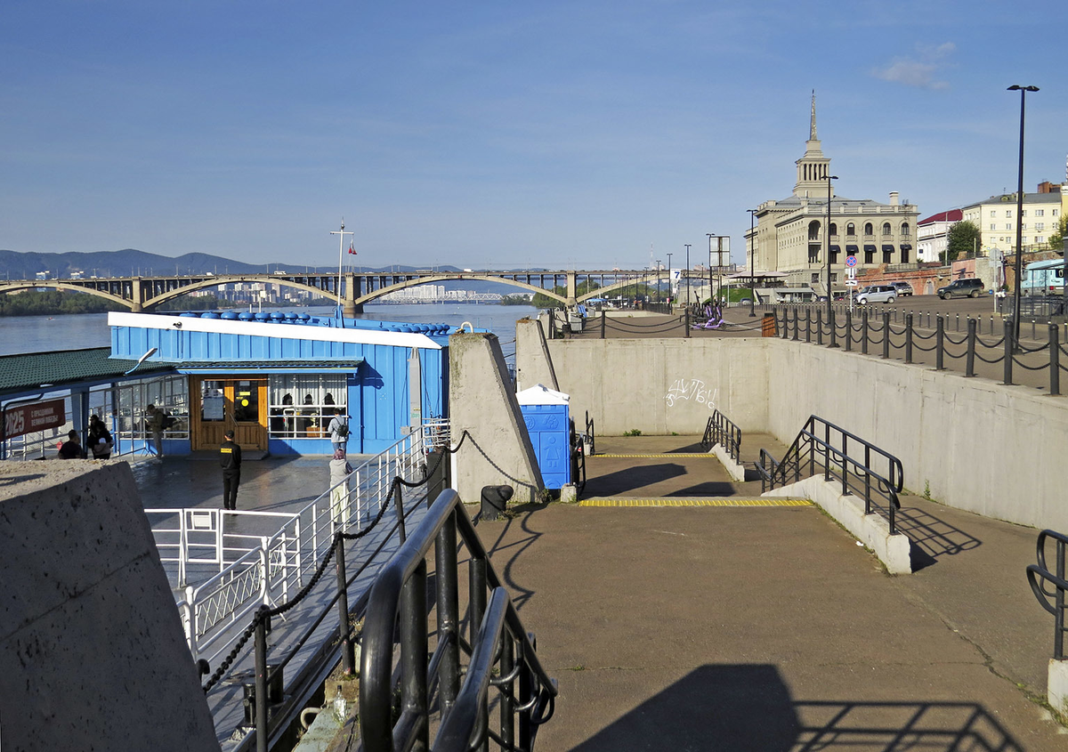 Полюбоваться Красноярском с Енисея можно, сев на судно (рейсовую "Зарю" или прогулочные теплоходы) выше Коммунального моста (1956-61), каждому знакомого по 10-рублёвой купюре. Менее очевидно, что мост слагает единый ансамбль с Речным вокзалом (1949-52), который своей монументальностью даст фору большинству вокзалов железнодорожных.
