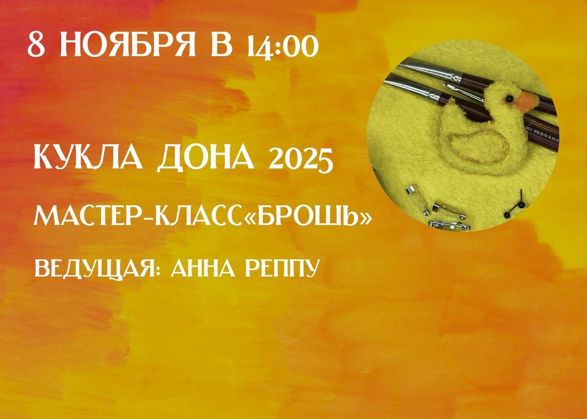 Мастер-класс «Брошь» | XVIII МЕЖРЕГИОНАЛЬНЫЙ ФЕСТИВАЛЬ «КУКЛА ДОНА» Под руководством талантливого художника-кукольники вы: ✨ Своими руками сваляете объёмного утёнка. ✨ Научитесь работать с вискозой — удивительно мягким и податливым материалом. ✨ С помощью масляной пастели придадите вашему украшению идеальный солнечный оттенок! Эта милая брошь станет ярким и тёплым акцентом в ваших осенне-зимних нарядах, напоминая о самых счастливых летних днях. 🧡 Ведущая мастер-класса: Анна Реппу — мастер авторской куклы, руководитель секции «Художественная кукла» Ростовского регионального отделения «Творческого союза художников России» (г. Ростов-на-Дону). 🔺 8 ноября, 14:00-15:30 🔺 Лекториум ДГПБ, 0 этаж 🔺 Вход по платным билетам. (6 мест) 🔺 12+ Приобрести билеты на мастер-классы можно в Отделе регистрации читателей и статистики библиотечного обслуживания (1 этаж). 🫠 Детские мероприятия Ростов-на-Дону. Я местный! 📱 Мероприятия Ростов-на-Дону. Я местный! в MAX