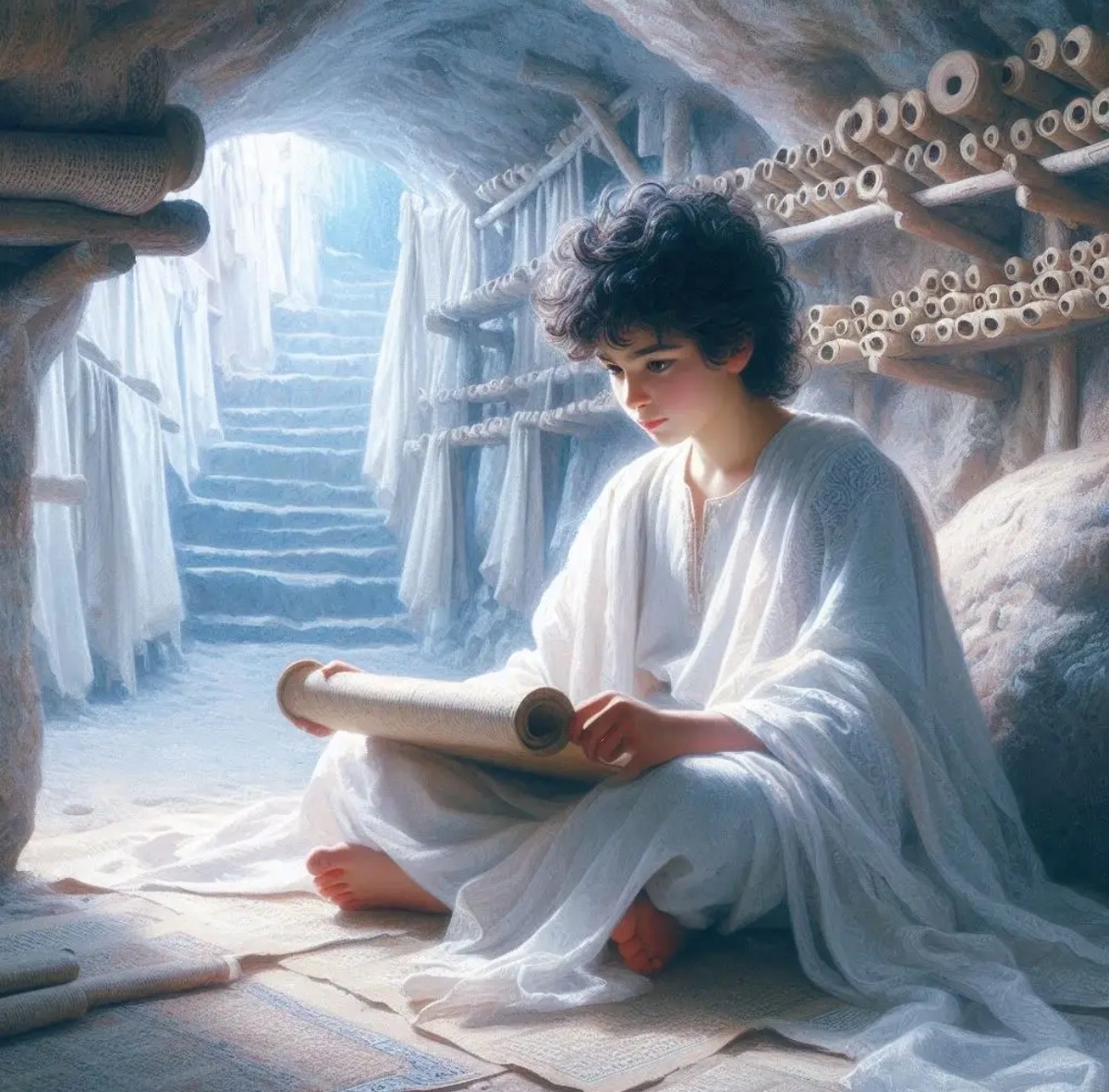 П: Он сейчас в библиотеке. Она каменная, выдолбленная в пещере. Иисус сидит в позе медитации, на коленях разложен свиток. Это происходит перед выпуском, ему семнадцать лет.