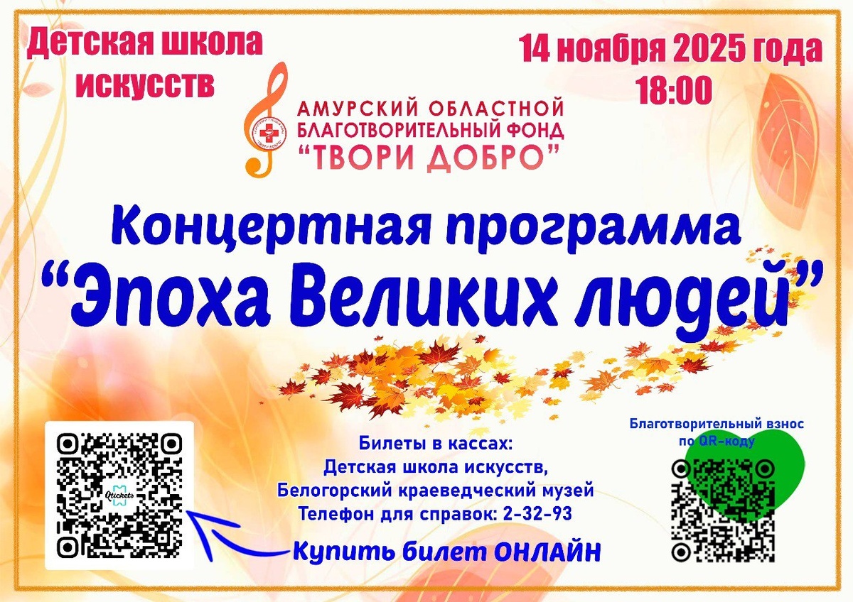 В Белогорске вновь проведут концерт Амурского областного благотворительного фонда «Твори добро». Программа «Эпоха великих людей» состоится 14 ноября в 18:00. Средства, собранные в ходе концерта, будут направлены на помощь детям, которые нуждаются в лечении и реабилитации. — Мы вновь подготовили очень необычное мероприятие, — поделился председатель комитета Заксобрания области по вопросам экономики, природопользования и аграрной политике, руководитель фонда «Твори добро» Андрей Рудь. — Зрителей ждёт много интересного. Наши концерты уникальны тем, что мы показываем каждую программу только один раз и приглашаем ярких, талантливых артистов. Эта программа — не исключение. Гостей ждёт масса положительных эмоций и, конечно, подарки. Благотворительный концерт состоится в Детской школе искусств. Билеты можно приобрести в Детской школе искусств. Узнать о наличии билетов можно по телефону: 2-32-93. Ранее сообщалось, свою работу фонд «Твори добро» ведёт вот уже более 15 лет. Идея помощи детям, нуж