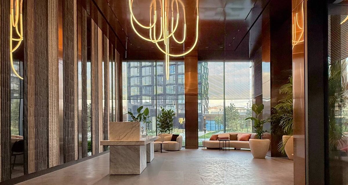 Интерьеры лобби, территория, подземный паркинг.
