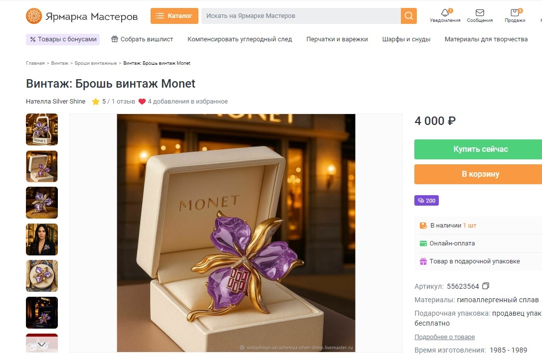 Рассмотрим брошь поближе. Представлена продавцом как одна из самых известных от компании Monet. Годы выпуска обозначены - 1985-1989.