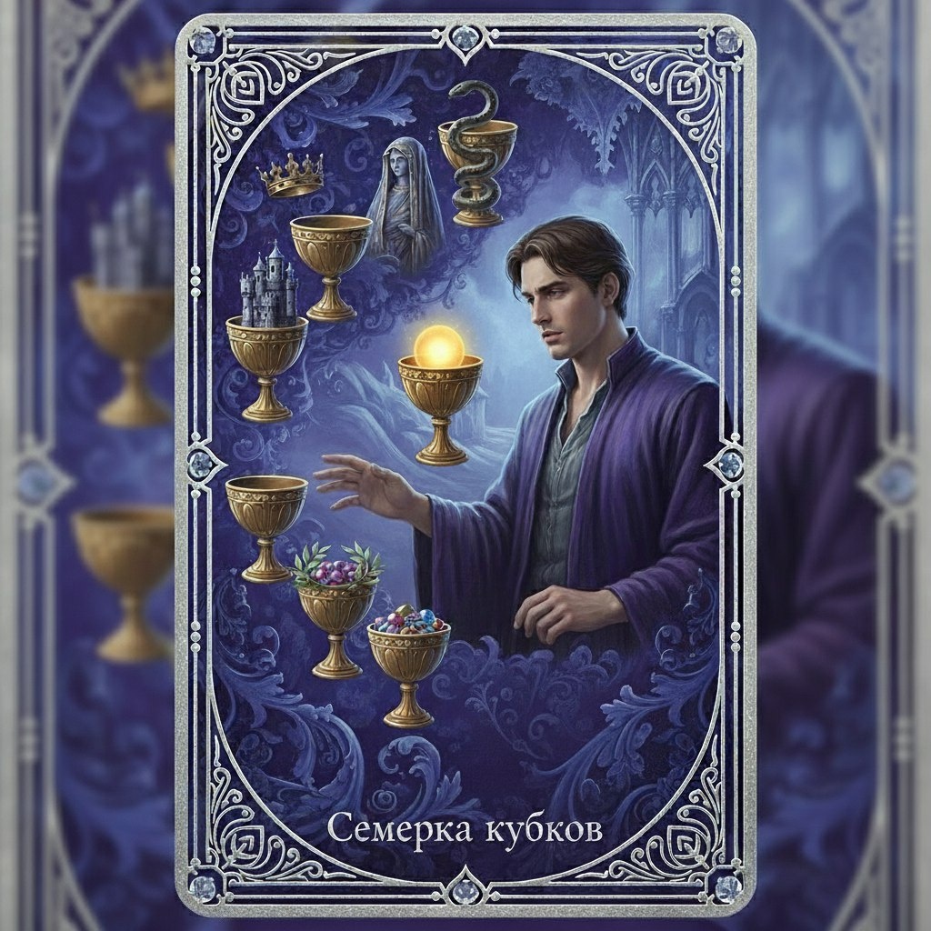 Ты спрашиваешь карты: что он чувствует, о чём думает и к чему реально готов? Расклад выложился так, что в нём слышно и шёпот, и рокот мотора. Семёрка Кубков, Луна, Король Жезлов, Колесница, Девятка Кубков — словно кадры одного фильма: туманное вступление, вспышка огня, ускорение и сладкий титр в финале. Поехали разбирать по-честному, без сахара, но с любовью к нюансам.