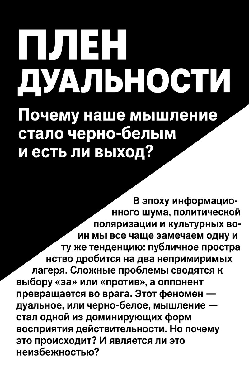В эпоху информационного шума, политической поляризации и культурных войн мы всё чаще замечаем одну и ту же тенденцию: публичное пространство дробится на два непримиримых лагеря. Сложные проблемы сводятся к выбору «за» или «против», а оппонент превращается во врага. Этот феномен — дуальное, или черно-белое, мышление — стал одной из доминирующих форм восприятия действительности. Но почему это происходит? И является ли это неизбежностью? Любое дуальное мышление — это упрощённая карта реальности. Оно дробит целостные явления на противоположности: добро/зло, своё/чужое, правильное/неправильное. Хотя такой подход полезен для быстрого принятия решений, он превращается в ловушку, когда речь идёт о сложных системах. Почему дуальность — это тупик: Осознание ограниченности дуального подхода — первый шаг к более зрелому и гибкому мышлению. Дуальное мышление редко возникает само по себе. Его часто формируют или непреднамеренно усиливают социальные и политические системы. Советская образовательная
