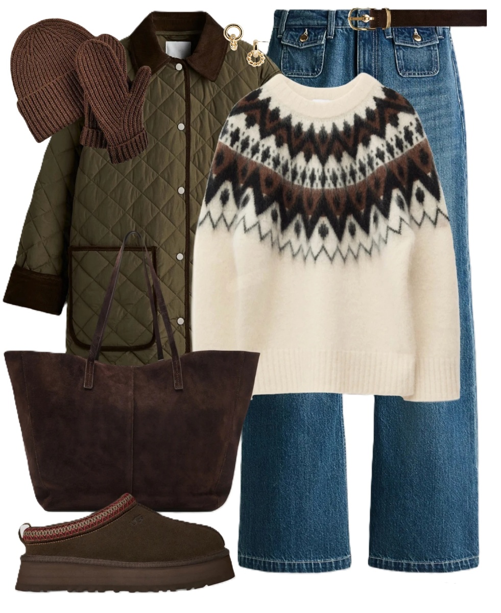 Джемпер в скандинавском стиле, прямые широкие джинсы и стёганое пальто оливкового цвета - этот образ практичен и продуман. Шерстяной джемпер согревает и легко сочетается с верхней одеждой, джинсы прочные, не сковывают движений и подходят для долгих прогулок. Стёганое пальто лёгкое, водоотталкивающее и удобное в носке благодаря кнопкам и карманам. Большая сумка из мягкой кожи вмещает все необходимые вещи, а коричневые укороченные угги с толстой подошвой тёплые и нескользящие. Шапка и варежки в тон завершают комплект и обеспечивают дополнительный комфорт в холодные дни.