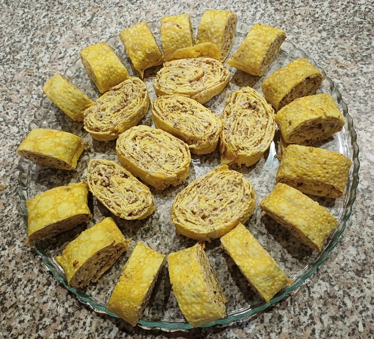 Ингредиенты: 3 яйца, 3 ст. ложки майонеза, 1 чайная ложка муки. Все продукты смешать,хорошо взбить и выпечь тонкие блинчики на смазанной растительным маслом сковороде,но только с одной стороны. Остудить,затем блинчики сложить друг на друга по 4-5 штук смазывая каждый слой смесью из майонеза и тертого чеснока и посыпая измельченными грецкими орехами. Блины скрутить в рулет,а затем разрезать на кусочки и уложить на блюдо. Приятного аппетита!