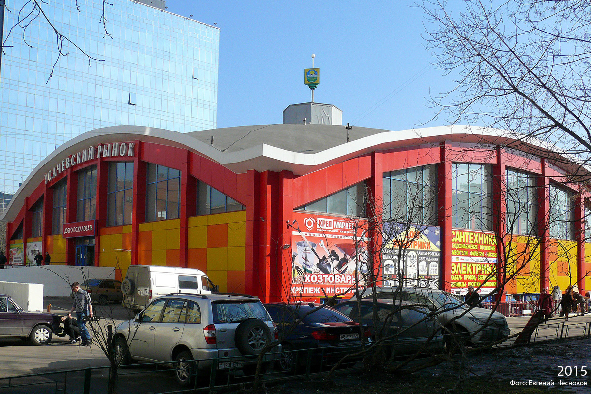 Усачёва улица, 26 - Усачёвский рынок (1977). Торговые ряды появились здесь ещё в XIX веке во владении купцов Усачёвых, в 1934 году торговлю упорядочили - открылся большой колхозный рынок, там даже гостиница была для приезжих - Дом колхозника. В эпоху советского модернизма архитекторы и инженеры, вдохновлённые идеями американца Ричарда Фуллера, реализовали несколько эффектных проектов купольных зданий - цирк на Вернадке, спортивный зал в Лужниках, велотрек в Крылатском. И для крытых районных рынков тоже решили строить здания без промежуточных опор.