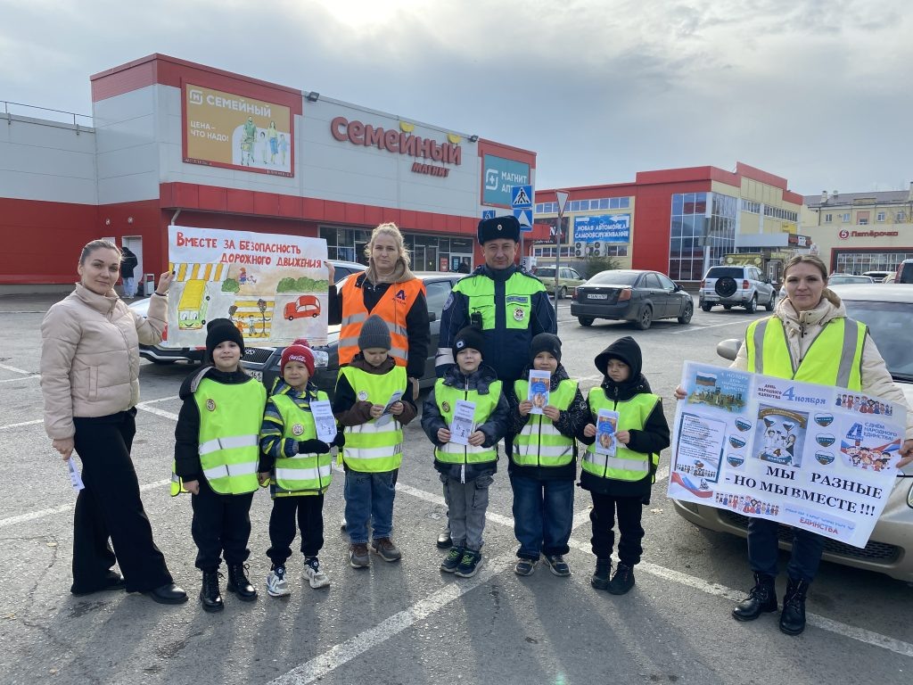 В честь Дня народного единства команда ЮПИД «Дорожный патруль» совместно с представителями инициативной группы «Родительский патруль» детский сад №32 и инспектором по пропаганде БДД отделения Госавтоинспекции МО МВД России «Каменский» старшим лейтенантом полиции Александром Александровичем Новиковым организовали масштабную акцию «Вместе — за безопасность дорожного движения», направленную на привлечение внимания общественности к вопросам дорожной безопасности. Главной целью мероприятия стало объединение усилий всех участников дорожного движения в борьбе против нарушений ПДД. В рамках акции участники распространяли листовки и буклеты с основными правилами дорожного движения для пешеходов, а также поздравляли с праздником. Благодаря активному участию юных помощников инспекторов движения и сотрудников Госавтоинспекции удалось привлечь внимание широкой аудитории к проблемам безопасности на дорогах и напомнить каждому участнику дорожного движения о личной ответственности за свою жизнь и здор