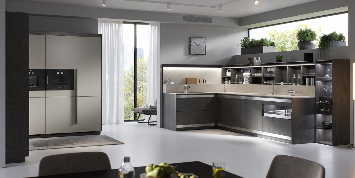 Новая композиция модели Synthesis подтверждает: подлинная элегантность рождается из строгой сдержанности и безупречной работы с материалами. Это диалог между тактильной теплотой шпона, холодным благородством нержавеющей стали и аутентичной фактурой керамики. Строгие линии и четкие, выразительные формы создают впечатляющий, лаконичный дуэт кухни и гостиной. Отличительная особенность модели - фасады из шпона с накладками из нержавеющей стали. Их симметричное расположение формирует четкие горизонтальные ритмы, создавая визуальную целостность и гармонию. Инженеры Giulia Novars переосмыслили классическую идею шкафа-запасницы, предложив вариант с увеличенной глубиной. Это универсальное пространство, которое теперь скрывает не только небольшую кухонную утварь, но и малогабаритную технику. Интеллектуальная подсветка, механизм плавного опускания фронтальных панелей этого шкафа активируются сенсорным управлением. Еще одна новинка - блок-система, расположенная в пристенной зоне, обеспечивает макс