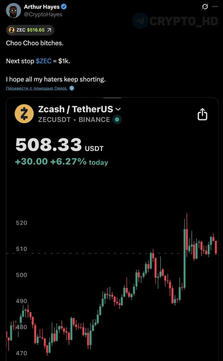 #zec 👀 Артур Хейс снова заряжен оптимизмом в отношении Zcash. По его словам, следующий этап – ZEC = $1000. Ранее: - ZEC = $500+ - +2421% с июля - $10,000 ? - риски Crypto Headlines