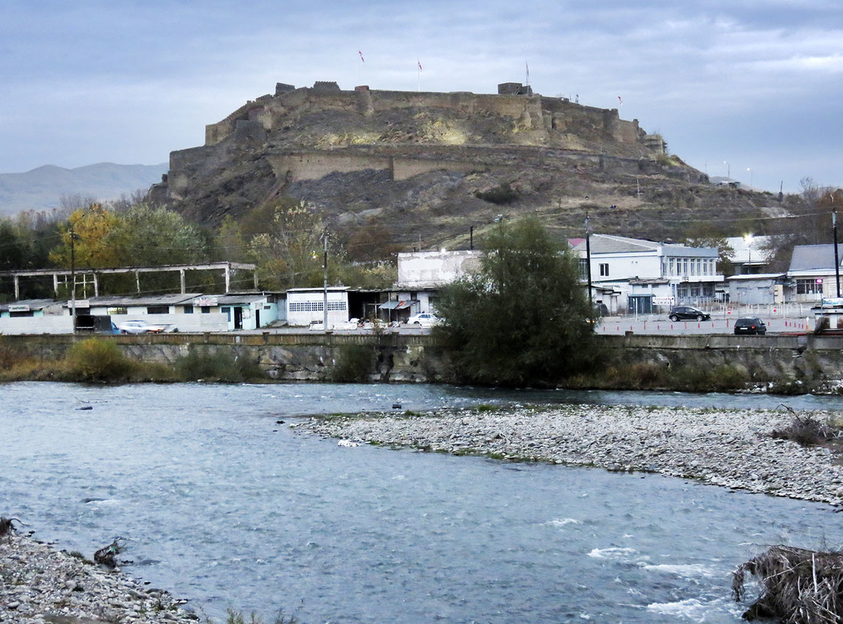Удивительно, но "гора" по-грузински значит почти то же, что и по-русски, с той разницей, что мы в Стране Великих равнин так называем именно что гору, а грузины меж двух Кавказов - холм. Соответственно, Горисцихе может значить как Горийская крепость, так и Крепость-на-Холме. Холм этот, грозный крутой останец, стоит посреди совершенно плоской поймы у слияния аж трёх рек, образующий на карте букву "Ⴞ" ("х" с придыханием), так удачно имеющуюся в грузинском алфавите.