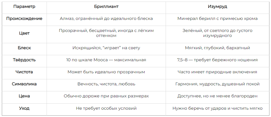 Бриллиант поражает своей игрой бликов и исключительной твёрдостью — это камень, который практически невозможно поцарапать. Украшения с ним выглядят роскошно и универсально, подходят к любому стилю и случаю. Изумруд, напротив, покоряет насыщенным зелёным цветом и загадочной глубиной. Он мягче по структуре, поэтому требует аккуратного обращения, зато его природная энергия и редкость делают каждое изделие с ним по-настоящему особенным. Если вы хотите понять, какой подойдёт именно вам, смотрите сравнение ниже.