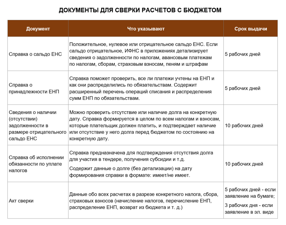 Сверку расчетов с бюджетом лучше проводить регулярно. ⚡️Какие справки о расчетах с бюджетом можно получить в ИФНС? ✓ Сведения о наличии (отсутствии) задолженности в размере отрицательного сальдо ЕНС.