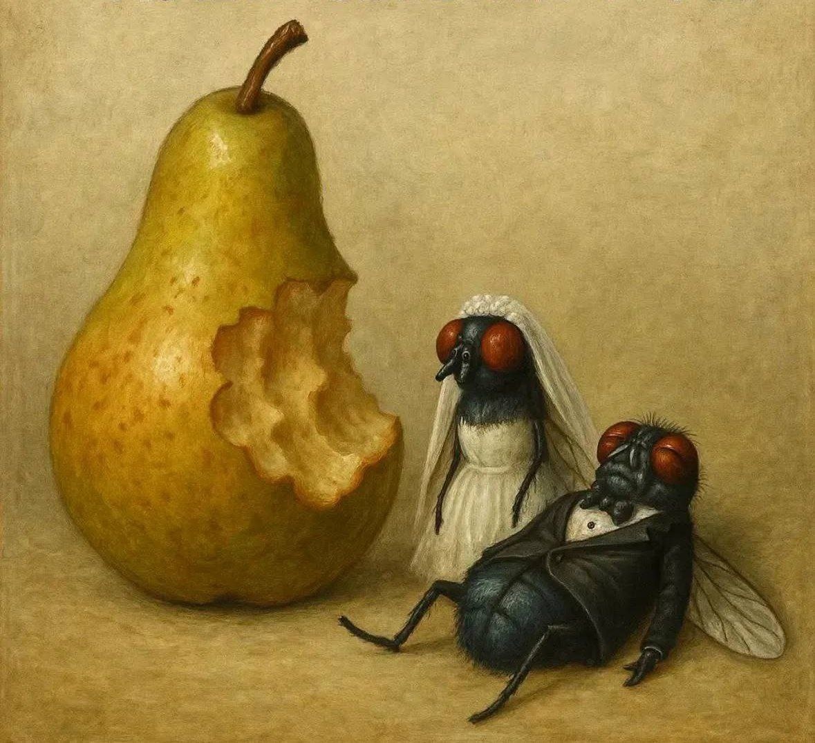 МУШ—ОБЪЕЛСЯ ГРУШ Муж мушки, мух, ты бедное созданье! Вкусив плодов, познал ты муки знанье. Объелся груш столь спелых, сочных, сладких, И вот лежишь, в агонии стеная. Не бьётся сердце, видя эти муки, Уходит жизнь, печальною разлукой. Зачем же глупый, жажде ты отдался? И в сладкой неге, разума лишался? Теперь лишь боль, и слабость в крыльях нежных, А груши те – лишь призрак грез мятежных. Как исцелить тебя, мое ты счастье? Как облегчить столь горькое ненастье? В глазах твоих – предчувствие конца, А я стою, беспомощна, тоскую. Прости меня, что не смогла увлечь, От искушения, что принесло страданья. Надеяться, молиться мне осталось, Чтобы утихла боль в твоей судьбе. И если суждено уйти тебе, Знай, что любовь моя – с тобой в пути. Но если чудо вдруг произойдет, И жизнь твоя опять к тебе придет, Будь помудрее впредь, мой милый друг, Не дай соблазну разорвать наш круг! Своею прихотью столь сладострастной.