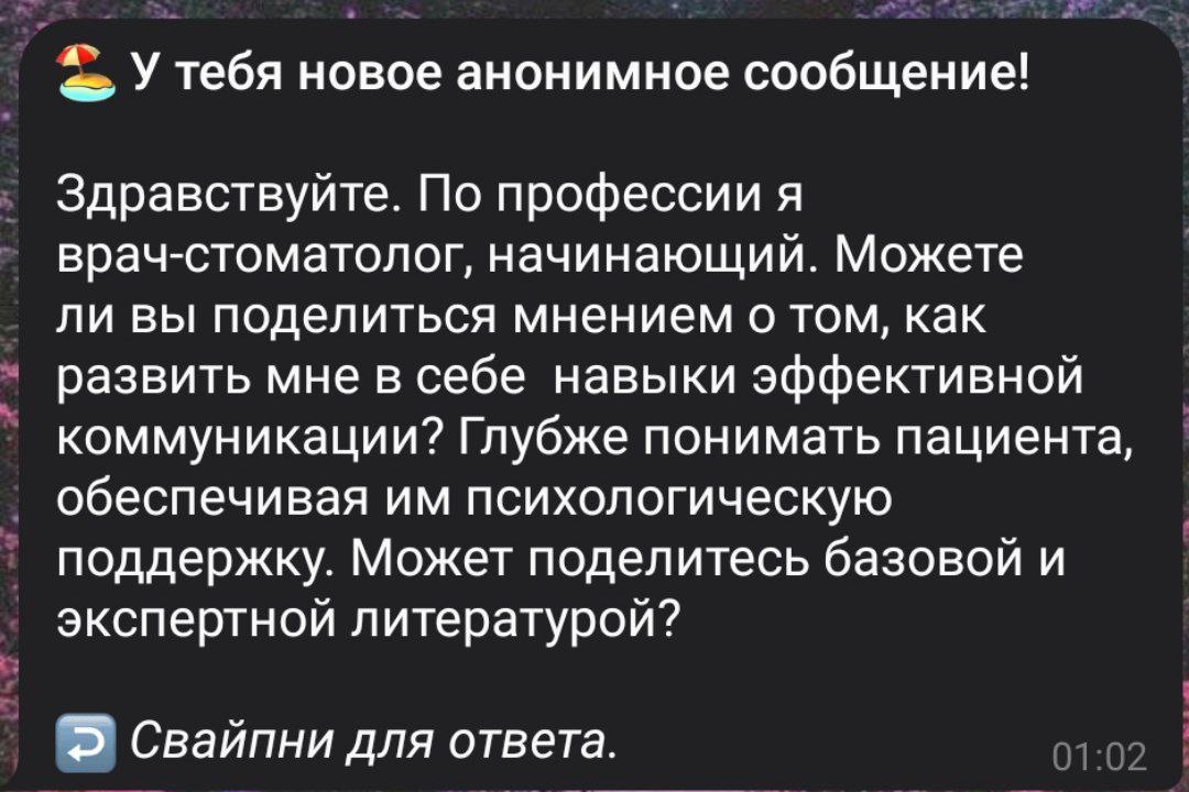 Заглянуть в душу или рот Во первых, здорово-то как - первая анонимка!) Во вторых - мне кажется, в одном аспекте наши профессии похожи: к нам чаще всего приходят люди в уязвимом состоянии Это факт - часть людей, возможно и бОльшая, боится врачей и особенно стоматологов Хотя бы в связи с "а раньше нас без анестезии лечили, за руки держали чтобы вырвался только мой зуб а не я" Анестезия стала распространённее, а стереотип и страх остался Что делать? В психологии, например, к каждому клиенту - индивидуальный подход: Кому-то в психологе нужен стержень и стальные нервы, знать, что он выдержит любой рассказ "Пусть тогда и стоматолог будет четко, по делу и не боится сделать мне больно" А кому-то наоборот - мягкость, осторожность, последовательность, чтобы расслабиться и довериться "Хочу, чтобы я мог держать во время приёма игрушку в руках и меня называли зайкой" Я бы не сказала, что есть что-то универсальное, однако возможно речь идет о том, чтобы "прокачать" эмоциональный интеллект