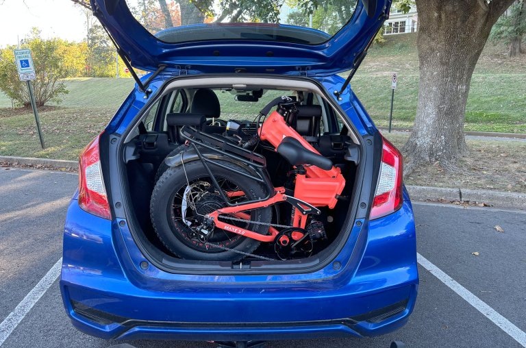 В сложенном виде Mars 3.0 помещается в кузове внедорожника или автодома, хотя его 32-килограммовую раму не так-то просто поднять. Есть удобная подставка, которая распределяет вес на движущиеся части, но из-за жёсткого шарнира и толстых шин сложить его могут только два человека. То же самое касается подъёма в мой хэтчбек, куда он просто поместился (как вы можете видеть выше). Запирание — ещё одна головоломка: без классической треугольной рамы и сверхтолстых шин U-образные замки не подойдут, если только вы не используете мотоциклетную версию. Лучше всего для фиксации рамы и заднего двигателя использовать две гибкие цепи или складной замок.