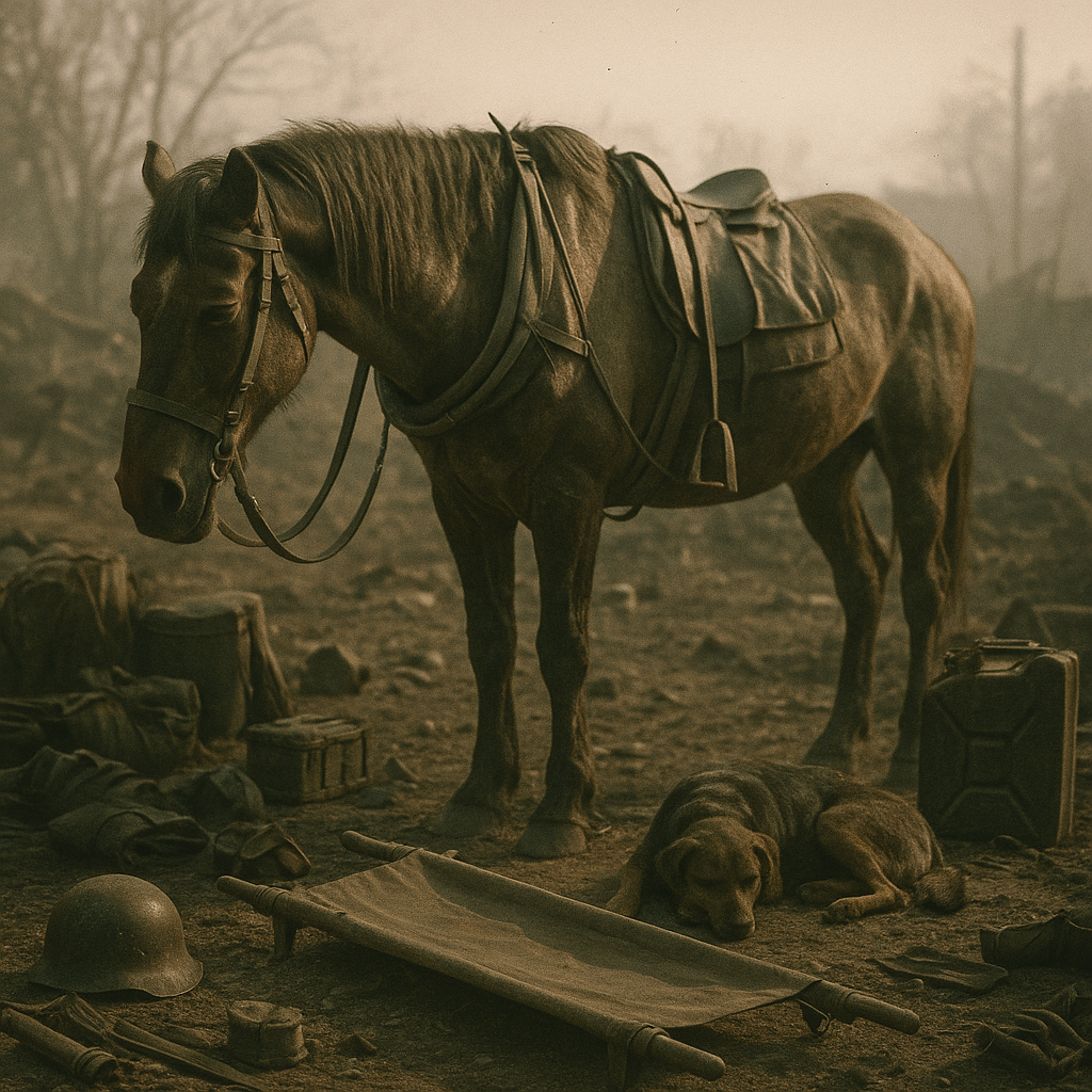 Лошади тянули орудия и фуры с продовольствием. Собаки искали раненых, несли перевязочные материалы. Голуби доставляли донесения под огнём.