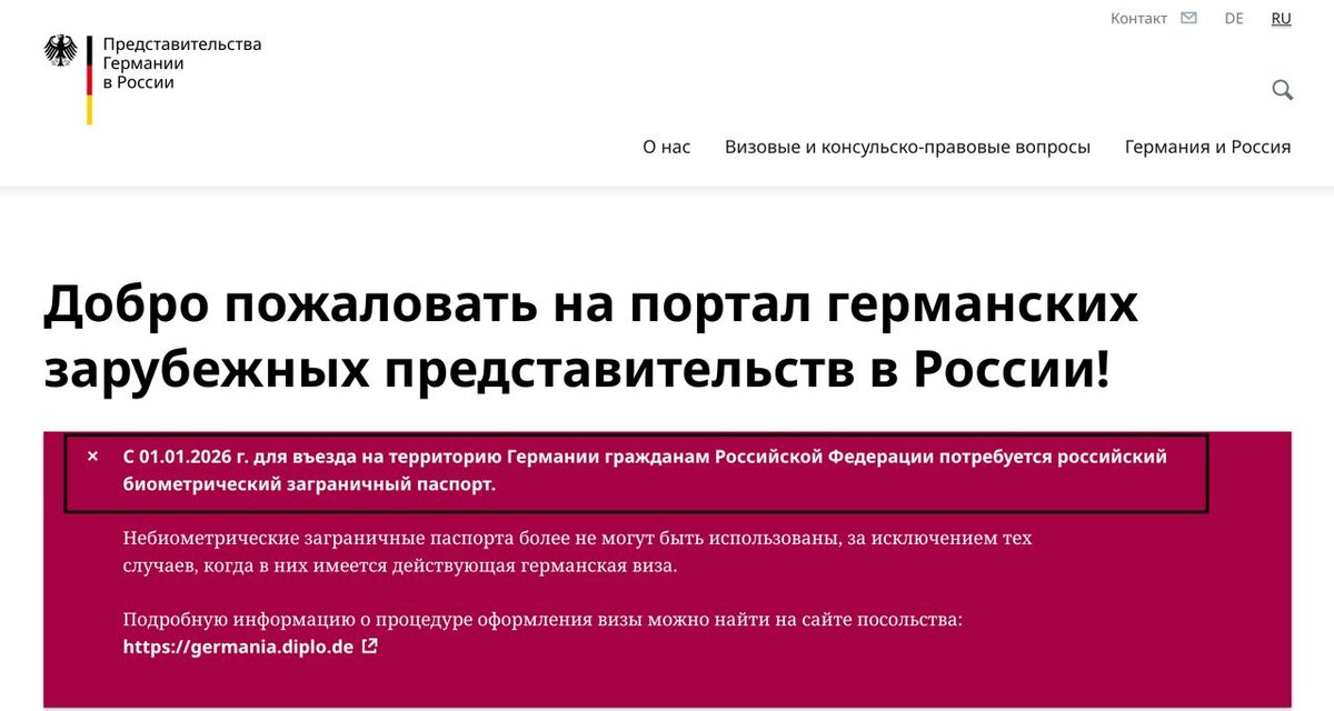 Германия закрывает въезд для старых российских загранпаспортов! 🇩🇪 С 1 января 2026 года Германия запрещает въезд с российскими небиометрическими загранпаспортами. 📄 Исключение сделают только для тех, у кого уже есть действующая немецкая виза, как сообщает посольство. 🌍 Теперь уже восемь европейских стран не признают такие паспорта: Дания, Чехия, Эстония, Франция, Исландия, Литва, Латвия и Германия. ✅ Владельцам биометрических загранпаспортов беспокоиться не о чем — для них правила не меняются. #Германия #паспорт #туризм @takeyourbackpack