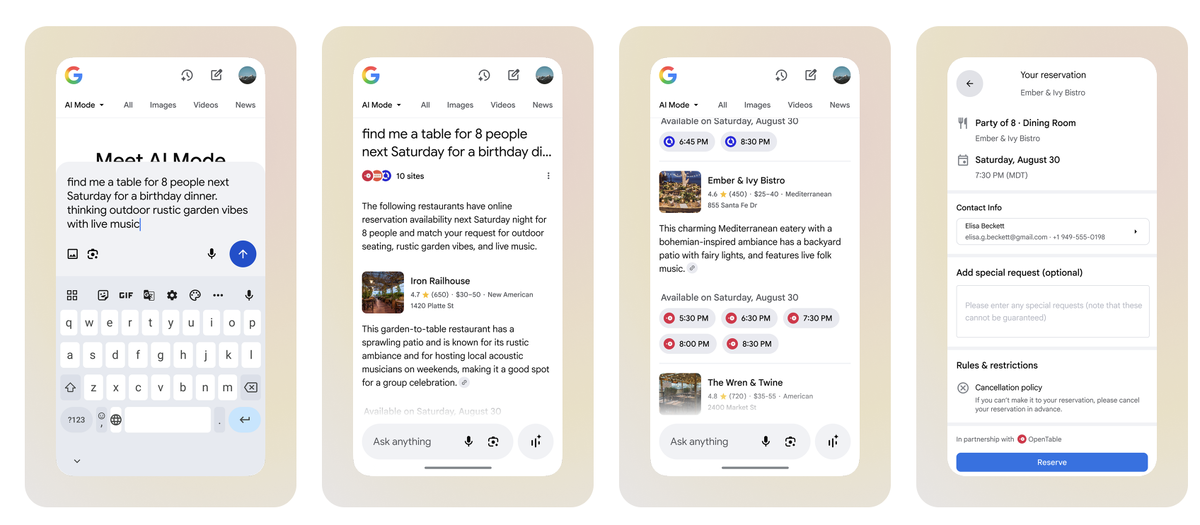 Режим искусственного интеллекта Google получил новые агентские возможности Во вторник компания Google объявила, что запускает новые агентные возможности в режиме искусственного интеллекта — функции, которая позволяет пользователям задавать сложные вопросы и уточнять информацию, чтобы глубже изучить тему прямо в поиске. Теперь пользователи могут получить помощь в бронировании билетов на мероприятия, а также в записи на косметические и оздоровительные процедуры в режиме ИИ. Например, вы можете сказать: «Найди мне два дешёвых билета на предстоящий концерт Shaboozey. Предпочтительнее билеты на стоячие места». Режим ИИ выполнит поиск на нескольких сайтах, чтобы найти билеты в режиме реального времени, соответствующие вашим запросам. Затем он предоставит вам список цен на билеты, из которого вы сможете выбрать. Режим ИИ перенаправит вас непосредственно на страницу бронирования, где вы сможете завершить покупку. Новые агентские возможности доступны всем пользователям экспериментального подраз