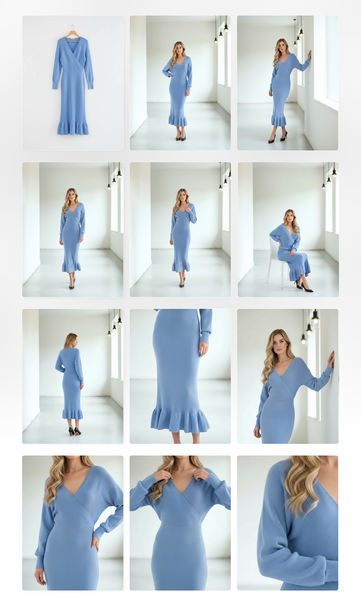В последние пару лет маркетплейсы диктуют абсолютно новые требования к подаче товара. Покупатель больше не хочет видеть «обычные» фото с белым фоном — он ищет вдохновение, эмоции, эффект присутствия! Как дизайнер, специализируюсь на создании уникальных виртуальных фотосессий и анимаций товаров с помощью нейросетей — и сегодня расскажу, как это работает на примере трикотажного платья. От одного фото — к серии продающих кадров Типичная ситуация: у клиента есть только одно фото платья на белом фоне. Визуал лаконичен, но малоинформативен и не выделяет товар среди конкурентов. Я провожу нейрофотосессию — современный инструмент в арсенале дизайнера маркетплейсов. Искусственный интеллект способен дорисовать модель, изменить ракурс, добавить динамику, «переместить» изделие в любой интерьер. Теперь у платья есть фотографии с разных сторон, крупные планы, посадка на фигуре, сценарии использования — всё это усиливает желание купить! Почему нейро-визуализация — must have для маркетплейса Современн