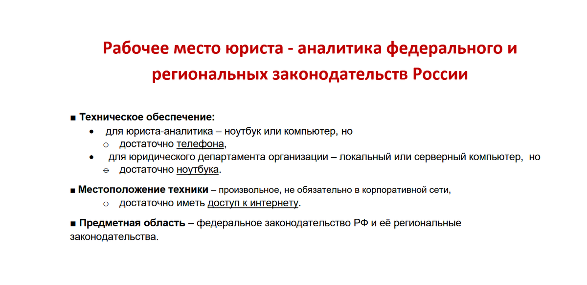 ■ Техническое обеспечение: ● для юриста-аналитика – ноутбук или компьютер, но достаточно телефона, ● для юридического департамента организации – локальный или серверный компьютер, но достаточно ноутбука. ■ Местоположение техники – произвольное, не обязательно в корпоративной сети, достаточно иметь доступ к интернету. ■ Предметная область – федеральное законодательство РФ и её региональные законодательства. ■ Целевое назначение: ● отслеживание в реальном масштабе времени изменений предметной области на заданные темы, ● своевременное реагирование на обнаруженные изменения. ■ Технологическое обеспечение: 1. Указываются государственные источники информации: ● источники федеральные, ● источники региональные, представляющие интерес. ✰ Они могут быть дополнены: ♢ федеральной и региональной прессой, ♢ частными порталами, ♢ телеграм-каналами, ♢ другими значимыми источниками. ✰ конкретные примеры некоторых источников приведены ниже в разделе «Ссылки». 2. Указываются темы наблюд