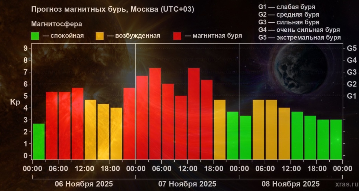 Самая сильная за год магнитная буря накрывает Землю Как сообщил «Осторожно, Москва» профессор Института космических исследований РАН, доктор физико-математических наук Сергей Богачев, в пятницу геомагнитная буря может стать одной из самых сильных за несколько лет. Средние и сильные бури также были зафиксированы сегодня около полуночи. Предварительный прогноз еще не учитывает последний сильный выброс солнечной плазмы, произошедший сегодня ночью. Бури такого уровня также могут повлиять на энергосистемы. «На данный момент, даже в ослабленном виде, без учета ночного выброса, прогноз показывает на завтра бури уровня G3-G4, то есть от сильных до очень сильных. При пересчёте в течение дня, этот диапазон с большой вероятностью переместится в интервал G4-G5», — добавил Богачев. Источник: Открыть