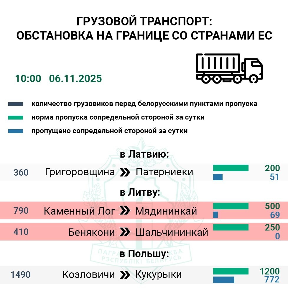 На границе Беларуси с ЕС сохраняется напряжённая ситуация с автомобилями, ожидающими въезда на сопредельную европейскую территорию. По данным Погранкомитета РБ, перед длительными выходными в очереди находится свыше 6 200 транспортных средств. Польское направление остаётся самым загруженным для фур. Перед погранпереходом «Кукурыки» («Козловичи») въезда в Польшу ожидают 1 490 фур. За сутки сопредельная сторона приняла на свою территорию 64% большегрузов от нормы. Перед литовским погранпереходом «Мядининкай» («Каменный Лог») находится 790 грузовиков. Через данный пункт пропуска в Литву за сутки проследовало всего 14% авто от нормы. Контролирующие службы латвийского пункта пропуска «Патерниеки» («Григоровщина») приняли на свою территорию 26% большегрузов. Въезда в Латвию ожидают 360 фур. Перед единственным доступным для легковушек польским погранпереходом «Тересполь» («Брест») фиксируется 3 000 единиц авто и 155 автобусов. Сопредельная сторона за сутки приняла на свою территорию 33% автомо