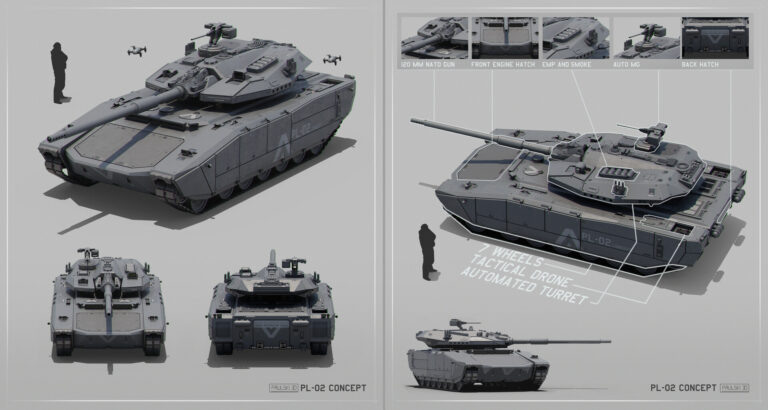 В мае этого года, или чуть раньше, появилась новость что поляки всё-таки решили развивать свою бронетанковую промышленность (не поздновато ли?) и реализовать концептуальный проект танка четвёртого поколения, получивший в Польской республике название PL-01. Получится это у поляков или нет, вопрос риторический, ведь сегодня, вообще, стоит вопрос о будущем танков как таковых, так как Россия на Украине демонстрирует что вполне можно обходиться и без них. Однако речь в этой статье не об этом, а о том каким будет польский ОБТ будущего, который скорее всего получит имя PL-02. Автор данной работы наш польский коллега и 3D-моделист, предположил, что серийная машина будет несколько отличатся от изначального концепта. Собственно вот так: Никаких ТТХ он приводит, предполагаю, что они будут такими же, как и у PL-01, которые кстати, так же ещё ни где не светились (вероятно их просто никто не проработал). Но главным визуальным отличием, по его мнению, будет наличие штатных коптеров, размещённых в над
