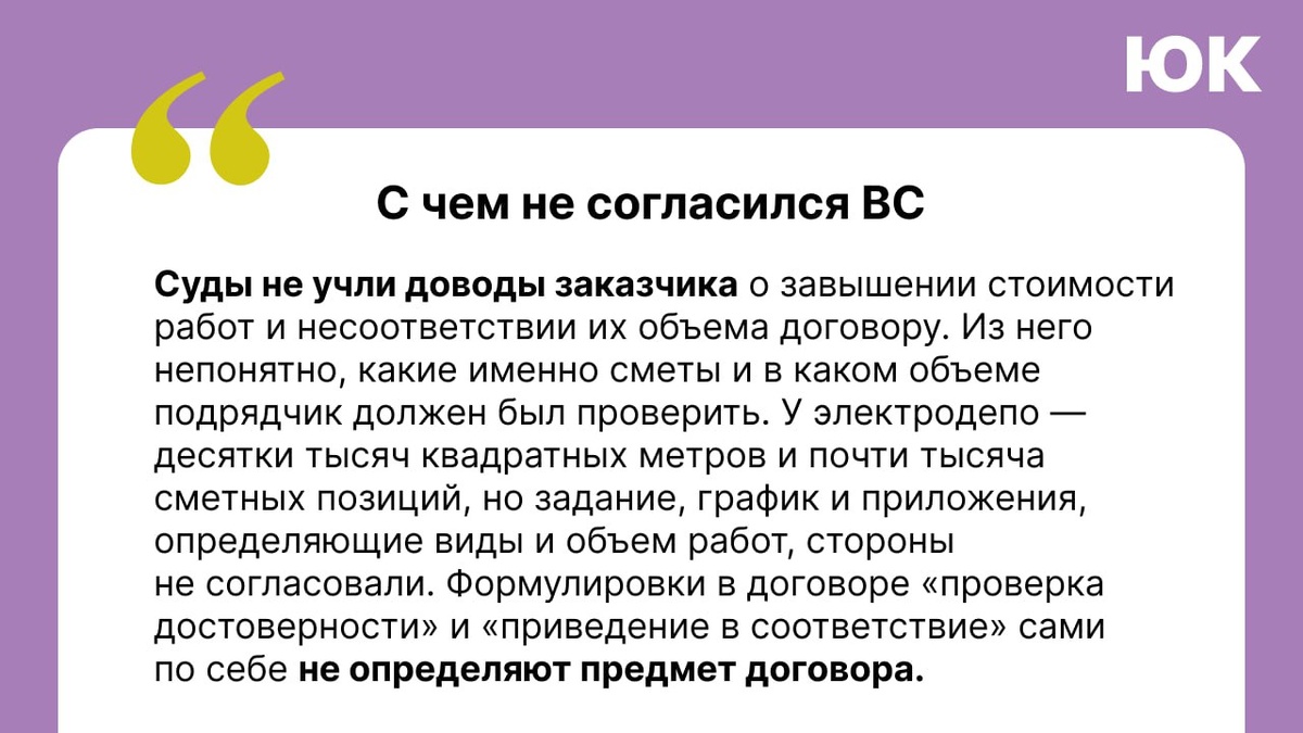 ВС: в договоре нужно прямо закреплять условия компенсации затрат подрядчика Верховный суд защитил компанию от попыток переложить на нее оплату завышенных и сомнительных расходов подрядчика. ВС напомнил: в договоре подряда стороны должны четко фиксировать предмет, состав и объем работ, а также сроки их выполнения. ✨ В чем суть спора. Стороны заключили договор на проверку достоверности смет при строительстве электродепо с ценой 50 тыс. руб. Подрядчик выполнил работы и понес расходы, но заказчик отказался их оплачивать. Тогда подрядчик обратился в суд с требованием взыскать 50 тыс. руб. долга и свыше 47 млн руб. расходов, связанных с исполнением договора. Заказчик потребовал признать договор и сопутствующие документы недействительными, так как обязательства по нему носили фиктивный характер и прикрывали иные цели. ⚖️ Что решили суды. Три инстанции требования подрядчика удовлетворили. Они исходили из того, что в договоре была обязанность компенсировать «затраты на организацию работ»,