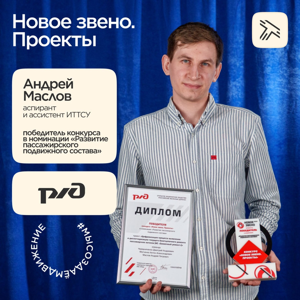 Аспирант ИТТСУ 💙 стал победителем инженерно-технического конкурса «Новое звено. Проекты» 🟥 По итогам финала, в котором участвовали 50 лучших молодых специалистов из более чем 5000 конкурсантов, первое место в номинации «Развитие пассажирского подвижного состава» заняла команда ФПК. В её составе — Андрей Маслов ✔️, выпускник профиля «Управление цифровыми инновациями», аспирант и ассистент ИТТСУ. ➡️Разработанный им проект «Цифровизация процесса выявления и диспетчеризации текущего безотцепочного ремонта пассажирских вагонов» представляет собой многоуровневую цифровую платформу, обеспечивающую полный цикл управления ремонтными заявками. За полгода команда создала функциональный прототип, а решение о его тиражировании на всю сеть ФПК и РЖД стало главным призом конкурса. Для Андрея Маслова это уже вторая масштабируемая разработка: ранее он создал и защитил программное обеспечение, заменившее санкционное ПО и внедрённое в Управлении маркетинга ФПК. Будь в курсе событий РУТ