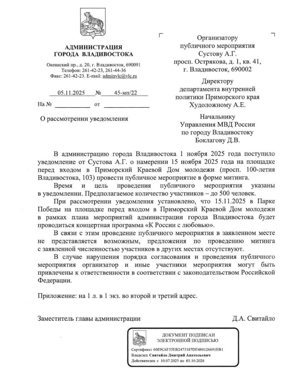 В документах, опубликованных Александром Сустовым, говорится, что проведение митинга невозможно, так как 15 ноября планируется концертная программа «К России с любовью», а 16 ноября — «День рождения Деда Мороза», и площадка будет занята праздничными мероприятиями.