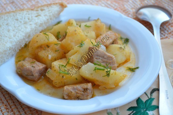 Жаркое по-домашнему Ингредиенты: Свинина - 400 гр. Картофель - 700 гр. Лук репчатый - 3 шт. Морковь - 150 гр. Вода - 500 мл. Укроп - 1 пуч. (в моем случае был сушеный) Соль - 7 гр. Перец черный молотый - 7 гр. Масло растительное - 40 мл. Томатная паста - 60 мл. (2 ст. л.) Источник: https://rusdinner.ru/page/zharkoe-po-domashnemu