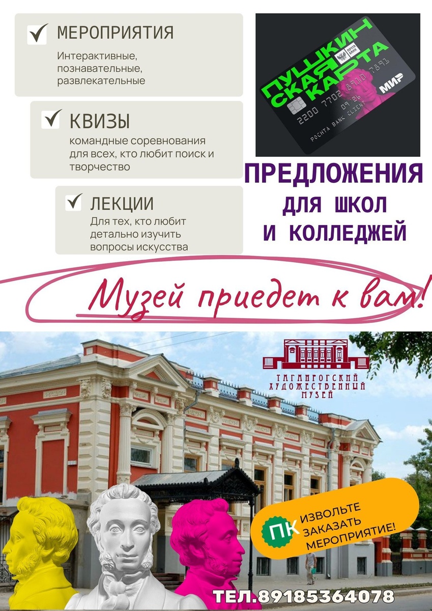Уважаемые педагоги! Таганрогский художественный музей предлагает мероприятия для учащихся и студентов-держателей Пушкинской карты. Это увлекательные пешеходные экскурсии по исторической части Таганрога и выездные мероприятия, которые станут частью образовательного и воспитательного процессов, помогут расширить кругозор и организовать полезный досуг для молодежи. Наши мероприятия интересны, познавательны, доступны для каждого! Надеемся на плодотворное сотрудничество с образовательными организациями города! #Таганрогский_художественный_музей #мероприятия_ТХМ #в_музее_интересно #пушкинская_карта
