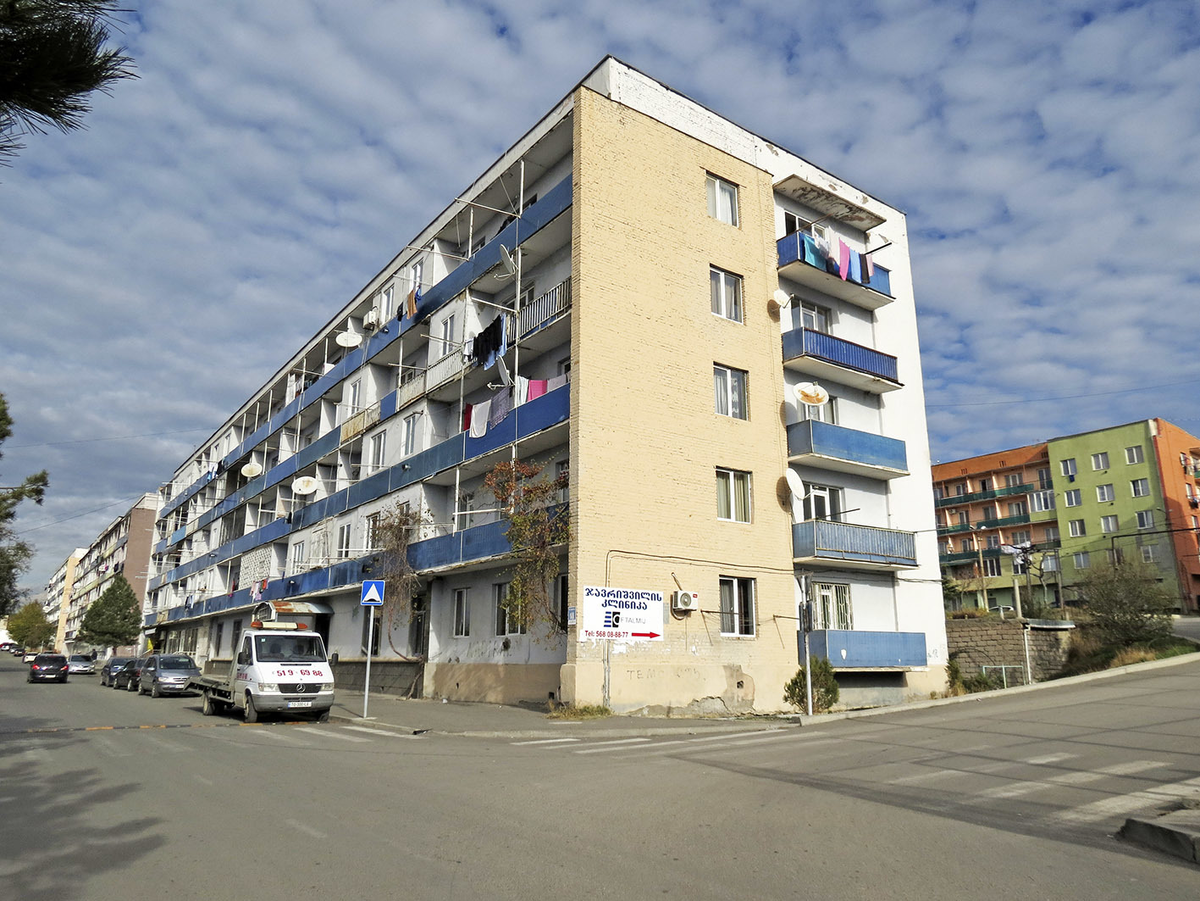 На окраине Гори, городка в 70 километрах западнее Тбилиси и всего в 25 километрах от Цхинвала, есть район Верхвеби - сиротливый квартал пятиэтажек у подошвы горы Квернахи (1072м), за которым начинается выжженная солнцем трава. И тут внимание на зеленовато-оранжевый дом справа: Вы могли видеть его фото в новостях... в августе 2008-го года, когда этот дом был разрушен взрывами снарядов и ракет. В тот август в Гори погибло 36 мирных жителей (причём 22 из них до сих пор числятся пропавшими без вести) - частью на главной площади от кассет "Искандера", частью - здесь. Конечно, эти жертвы не были целью: рядом и теперь что-то военное, а тогда располагалась новейшая база Грузинской армии по стандартам НАТО. По ней и целились, да только стреляли не очень-то метко... Всё читается теперь по состоянию домов: облезлые пятиэтажки отделались выбитыми стёклами и стояли как стоят, обновлённые посекло осколками и позже им сделали косметический ремонт, а вот угловой дом, и в особенности его торец со сто