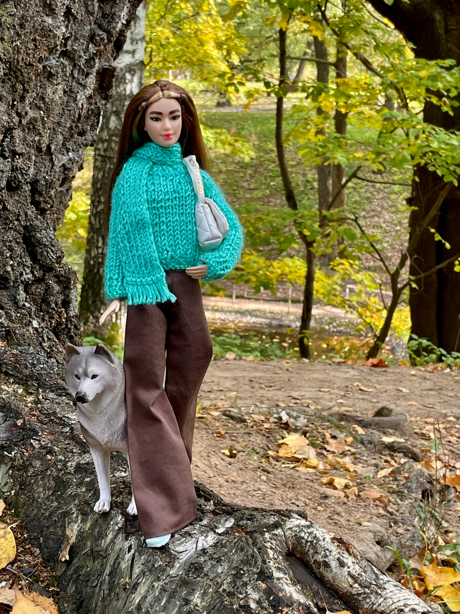 Глэдис неспешно шла вдоль пруда, когда Рэкс внезапно замер и навострил уши 🐕 Она проследила его взгляд и увидела рыжую белочку, которая ловко перепрыгивала с ветки на ветку. «Ну что, охотник, заинтересовалась?» — засмеялась Глэдис, присаживаясь на поваленное дерево. Рэкс тут же подбежал к ней с палкой в зубах — видимо, решил, что пора поиграть вместо охоты на белок. «Хороший мальчик, — погладила его Глэдис, — ты лучший компаньон для прогулок». Золотые листья кружились вокруг, а верный пёс уже нетерпеливо помахивал хвостом, ожидая броска 🍂 Свитер и брюки: #своими_руками